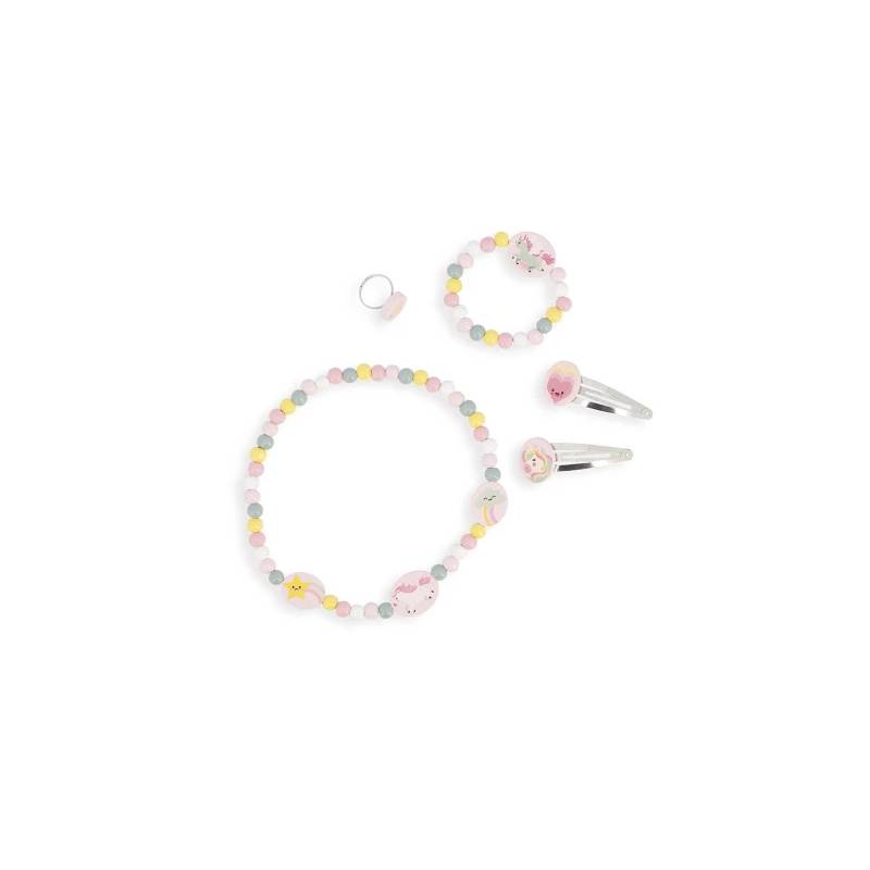 Chaque pièce est décorée sur le thème merveilleux des licornes, avec des couleurs pastel et des illustrations poétiques : arcs-en-ciel, étoiles et cœurs se mêlent pour un look tendre et féérique. Ce set complète parfaitement une tenue ou une coiffure, pour un style unique et plein de charme.