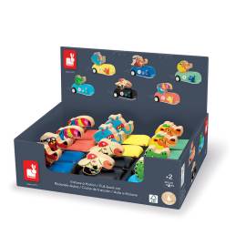 Chaque modèle est fabriqué en bois robuste, avec une bille à l’avant permettant une direction fluide et des virages amusants. Le petit personnage conducteur, joyeux et expressif, donne vie à chaque voiture et stimule l’imagination de l’enfant.