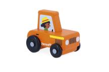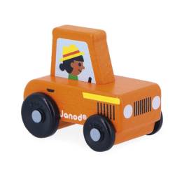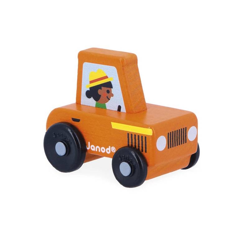 « En route pour le potager ! » Avec ce tracteur orange en bois Janod, les enfants dès 12 mois partent à la découverte de la vie à la ferme. Derrière le volant, la fermière file à travers champs pour surveiller sa récolte et transporter ses légumes vers le marché.