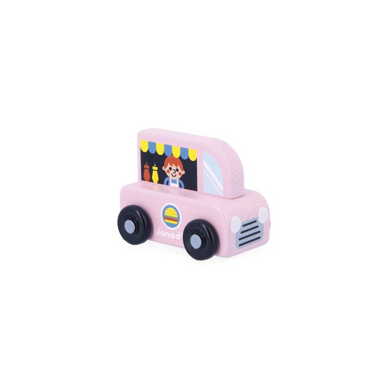 « Une petite faim peut-être ? » Avec ce food-truck en bois Janod, les enfants dès 12 mois s’invitent dans le monde des petits chefs ambulants ! Dans son coloris rose plein de pep’s, ce véhicule gourmand est prêt à servir glaces, hamburgers et donuts à tous les passants affamés du circuit Cross Roads.