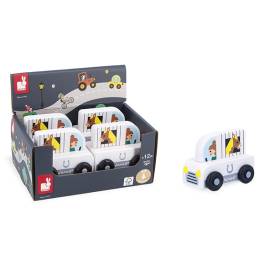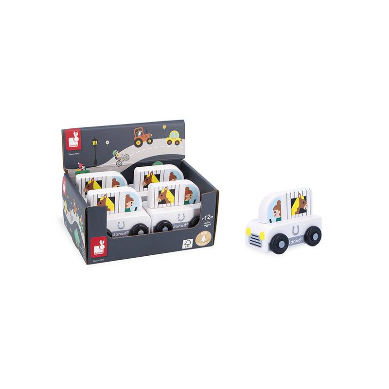 « En route pour le concours équestre ! » Avec ce van pour cheval en bois Janod, les enfants dès 12 mois s’amusent à transporter leur fidèle compagnon vers de nouvelles aventures à la campagne. Derrière le volant, la propriétaire du ranch veille au bon transport des équidés, prête à s’élancer sur les routes du tapis de jeu !