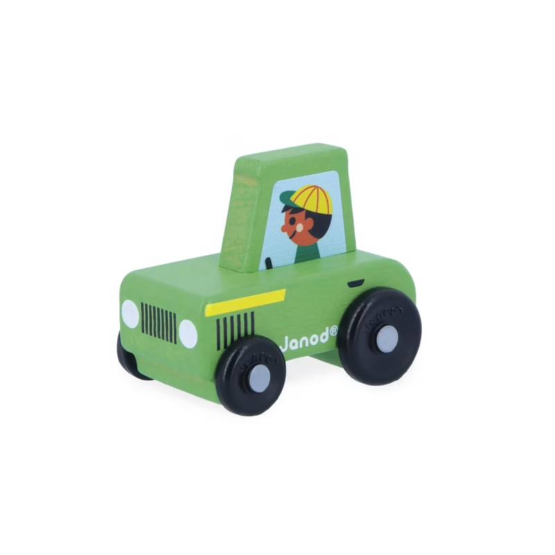 « On prend la clef des champs ! » Avec ce tracteur vert en bois Janod, les enfants dès 12 mois découvrent les joies de la vie à la campagne. Derrière le volant, le fermier se rend dans les prés pour ramasser les bottes de paille et s’assurer que tout se passe bien sur l’exploitation.