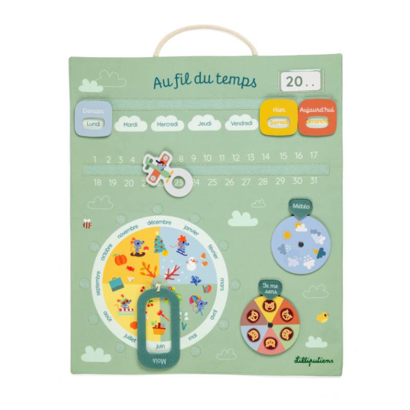 Chaque jour devient une nouvelle aventure avec le calendrier en tissu “Au fil du temps” de Lilliputiens ! Ce panneau d’activités éducatif, conçu pour les enfants dès 3 ans, aide les tout-petits à comprendre la notion du temps qui passe, à organiser leurs journées et à exprimer leurs émotions.