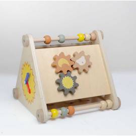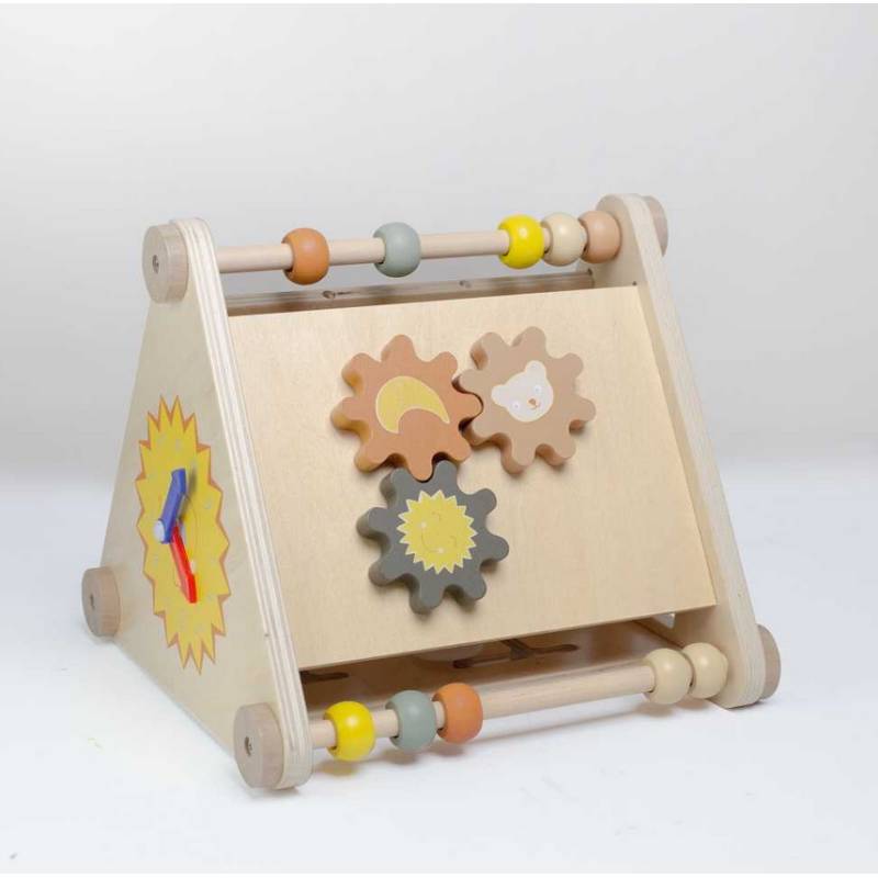 Chaque côté offre une activité différente pour encourager la motricité fine, la coordination œil-main, la logique et la créativité : labyrinthe à faire coulisser, perles à manipuler, engrenages à faire tourner, formes à encastrer (lune, étoile, arc-en-ciel) ou encore une horloge aux aiguilles mobiles pour une première approche ludique de la notion du temps.