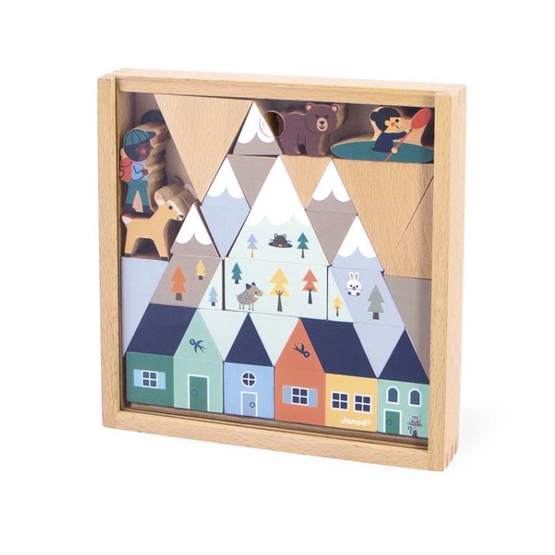 Avec ce magnifique set de cubes et personnages en bois, les enfants dès 2 ans créent leur propre village niché dans une vallée enneigée. Entre montagnes, petits habitants et animaux, l’imagination n’a aucune limite.