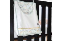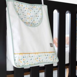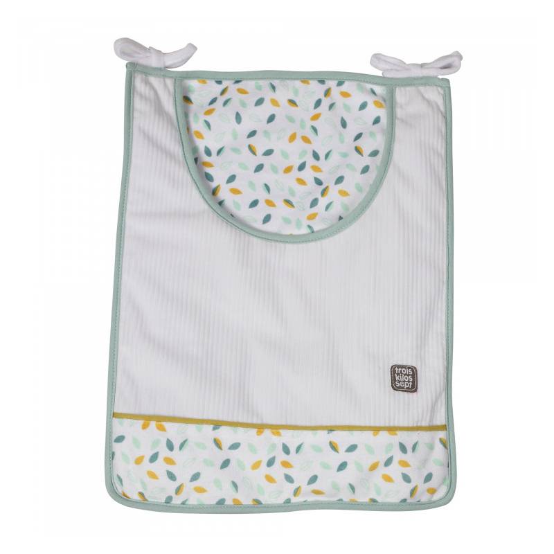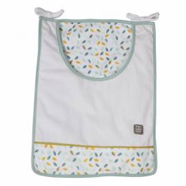 Il est décoré d'un imprimé feuilles moutardes et vert d'eau en all over et d'un liseré moutarde. Il s'attache grâce à des liens à nouer où que vous souhaitez.