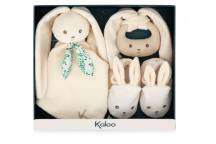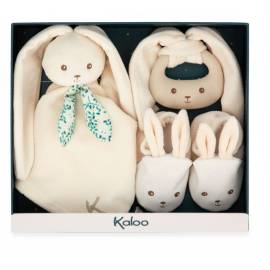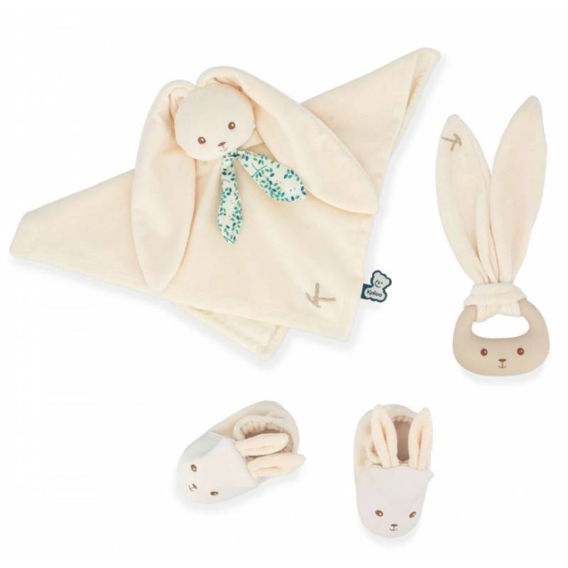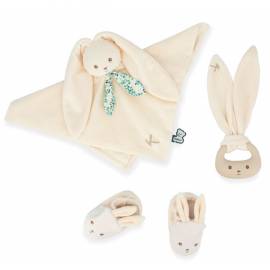 Contient 1 doudou lapin, 1 anneau de dentition en silicone, 1 paire de chaussons lapin