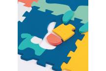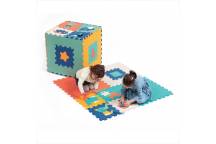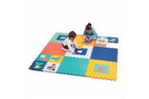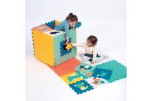 Tapis géant composé de 18 dalles de différentes tailles. Il isole l’enfant du froid et amortit les chocs. Jeu d’encastrement avec les petites dalles, les formes géométriques et les animaux.