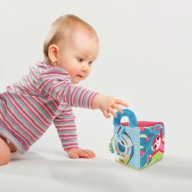 tout-petits. Conçu en tissu doux, ce cube propose diverses textures, couleurs et activités pour aider les bébés à découvrir le monde qui les entoure