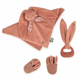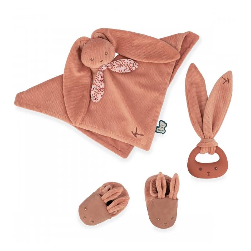 anneau de dentition en silicone et de charmants chaussons lapin, tous dans une magnifique teinte terracotta.