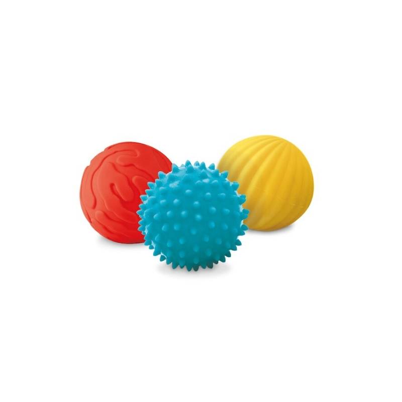 Conçues pour stimuler le sens du toucher et développer la motricité, chaque balle présente une texture différente : une balle nervurée, une lisse et une à picots.