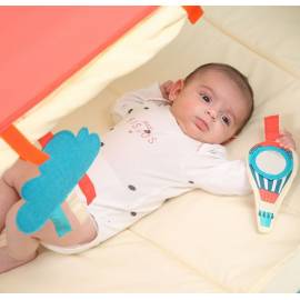 Activités sensorielles : Comprend deux activités amovibles pour éveiller bébé : une montgolfière matelassée en papier froissé et un miroir, ainsi qu'un nuage feutré aux multiples textures.