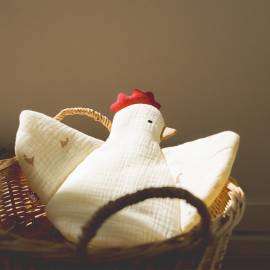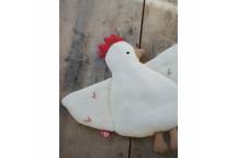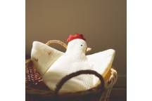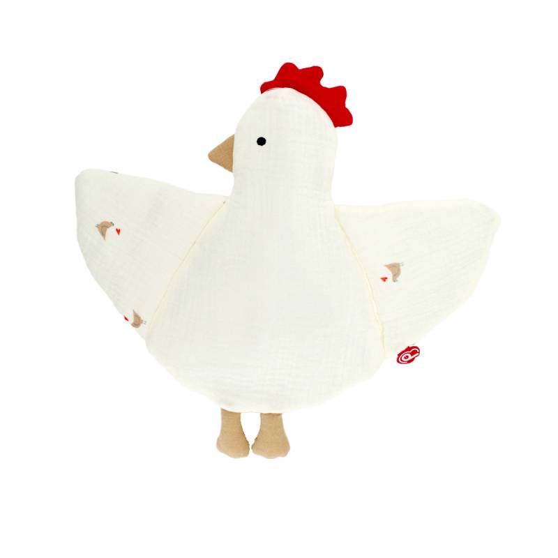 Forme originale : Représente une poulette avec yeux ronds, ailes imprimées, bec fin, pattes délicates et crête rouge.
