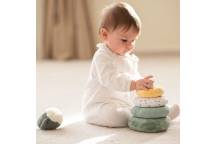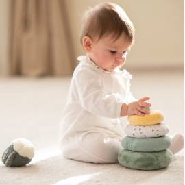 Une tour à empiler douce et ludique, conçue pour éveiller les sens et développer la motricité dès la naissance.
