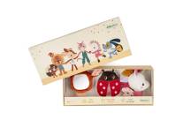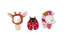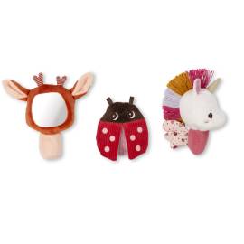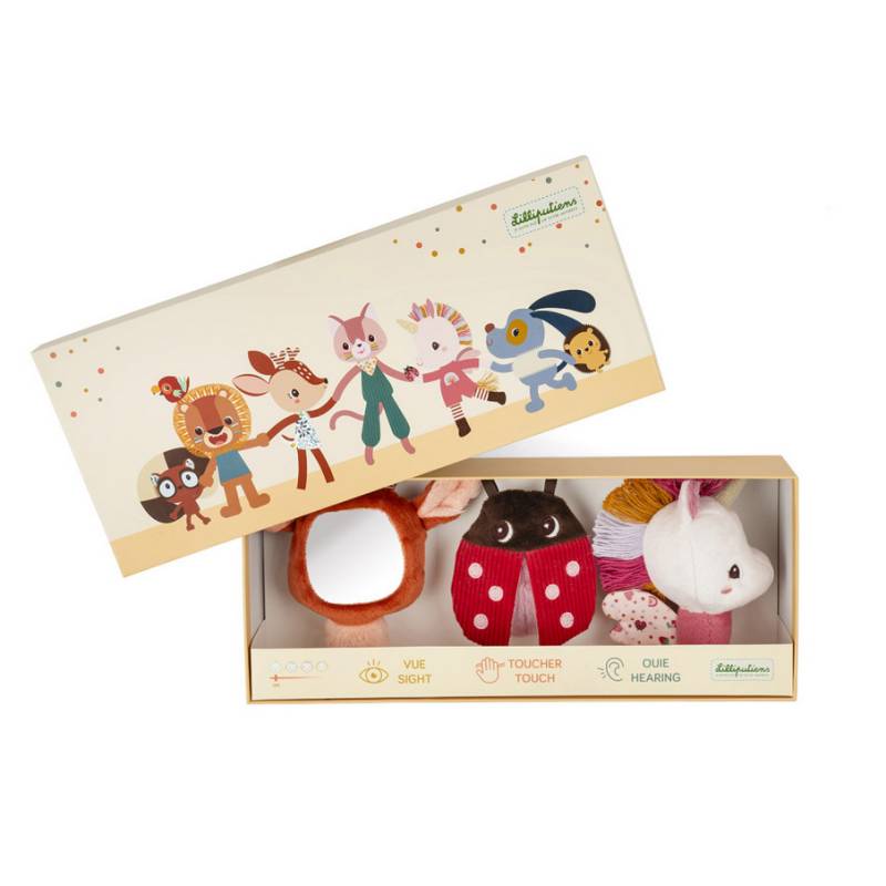 Ce coffret réunit trois hochets en tissu adaptés dès la naissance pour stimuler la vue, le toucher et l’ouïe. Lena la licorne au bruissement léger, Stella le faon avec son miroir et ses oreilles toutes douces, ainsi qu’une coccinelle aux multiples textures invitent bébé à explorer et à développer sa curiosité. Leurs formes sont pensées pour une prise en main facile par les petites mains.