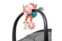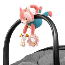 Jeanne le chat accompagne bébé en promenade grâce à sa cordelette facile à suspendre sur la poussette, le cosy ou l’arche d’éveil. Adaptée dès 3 mois, cette peluche d’activités propose trois éléments sensoriels : un miroir pour s’observer, une petite souris au papier bruissant et une fleur avec hochet à billes. De quoi stimuler la vue, le toucher et l’ouïe tout en amusant bébé.