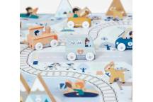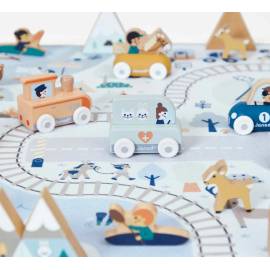 Le tapis peut être complété avec des véhicules et cubes en bois de la gamme Cross Roads (vendus séparément).