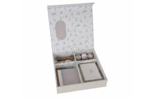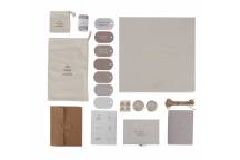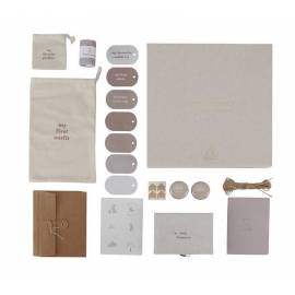 La boîte à souvenirs contient un livret, des étiquettes, de la ficelle de jute, des enveloppes kraft, une feuille d'autocollants, des coins photo, une boîte à cheveux en fer blanc, une boîte à dents en fer blanc, une boîte de rangement Little Treasures, un mètre ruban, un sac de rangement pour le premier vêtement et un sac de rangement pour la tétine.