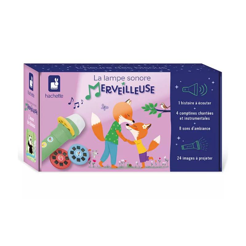 Elle combine un projecteur d'images et une conteuse sonore, créant ainsi une expérience immersive pour les tout-petits. Au total, 9 minutes de son sont disponibles : une belle histoire intitulée « Je t’aime tant » d’une durée de 3,5 minutes, 4 comptines accompagnées de leurs versions instrumentales d’une durée de 3,8 minutes (« Ainsi font, font, font les petites marionnettes », « Mon petit lapin », « Les petits poissons », « Dodo, l’enfant do ») et 8 sons thématiques immersifs de 126 secondes.