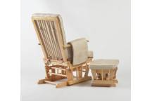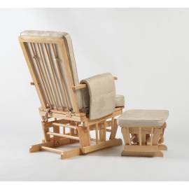 Le fauteuil est accompagné d'un repose-pieds assorti, également à bascule, qui permet une relaxation complète, idéale pour lire, se détendre ou apaiser un bébé. La structure en bois naturel est robuste et offre une longue durabilité.