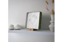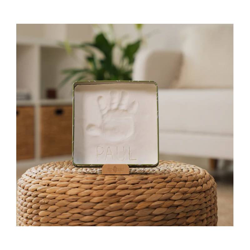 Le kit est accompagné d'un joli support décoratif en bois, ce qui permet de transformer l'empreinte en un cadre élégant à exposer dans la chambre de bébé ou dans le salon. Le design de la boîte avec des motifs de cœurs ajoute une touche douce et charmante à la décoration de la pièce.
