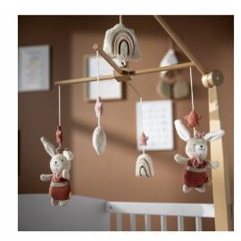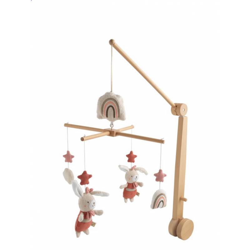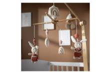 Le bras en bois orientable permet un positionnement optimal au-dessus du lit. La boîte à musique mécanique se remonte manuellement à l’arrière et dispose d’un bouton marche/arrêt pour interrompre la musique à tout moment. Le mobile est équipé d’un taquet anti-basculement pour une sécurité maximale.