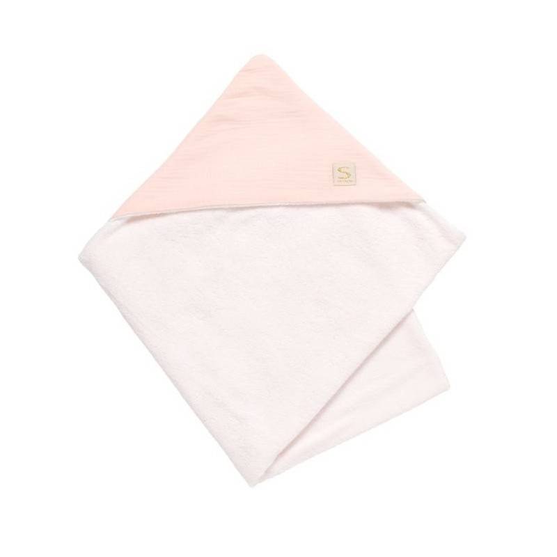Idéal pour un cadeau de naissance, cette jolie parure de bain en double gaze de coton rose, de la collection Les Unis avec accueillera bébé à la sortie du bain avec sa grande capuche et son éponge généreuse !