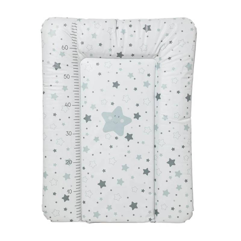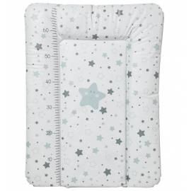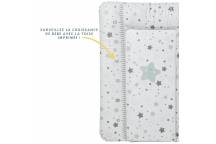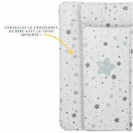 Le matelas à langer Essentiel est conçu pour faciliter le change de bébé au quotidien tout en assurant confort et praticité. Grâce à ses dimensions standards de 50 x 70 cm, il s’adapte à de nombreux modèles de tables à langer. Son design doux avec un fond gris clair imprimé d’étoiles et une toise intégrée permet de suivre facilement la croissance de votre bébé.