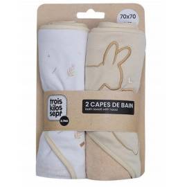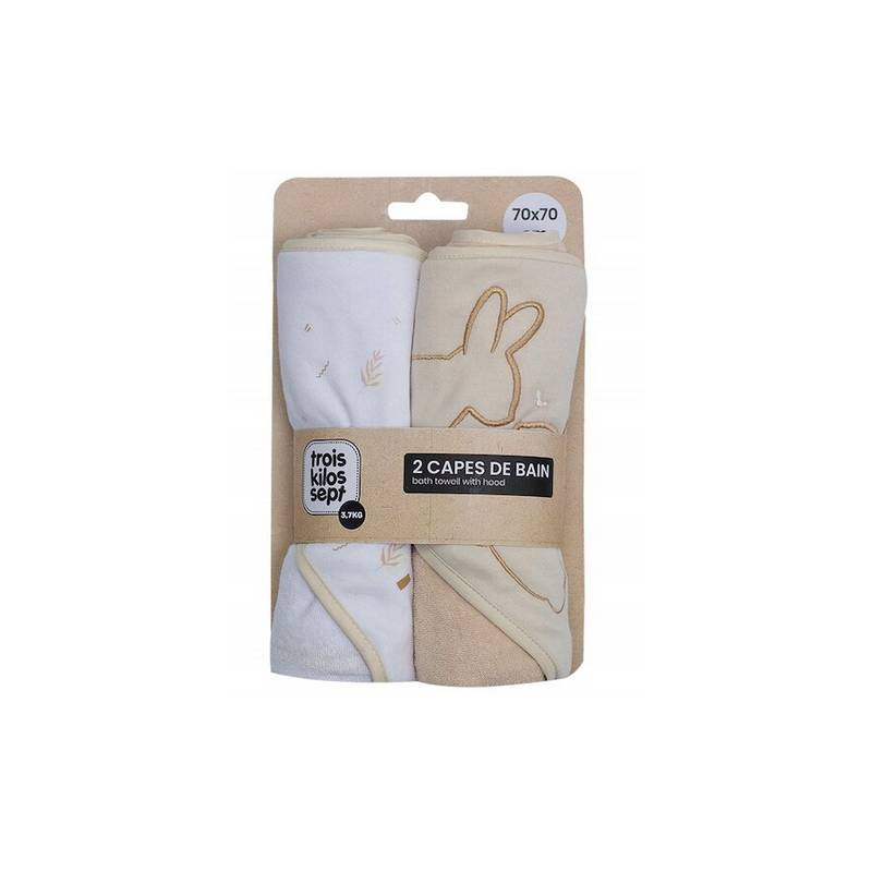 Ce lot de 2 capes de bain avec capuche, de 70 x 70 cm, est idéal pour envelopper bébé et le garder au chaud après le bain. Fabriquées dans une matière absorbante, elles permettent un séchage rapide, facilitant les routines quotidiennes tout en assurant confort et douceur à votre tout-petit.
