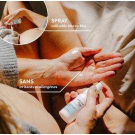 Vaporisateur utilisable tête en bas pour une application facile. Peut être appliquée directement ou réchauffée entre les mains. Utilisation recommandée 3 à 4 fois par semaine. Peut également être utilisée pendant l’accouchement pour soutenir le périnée.