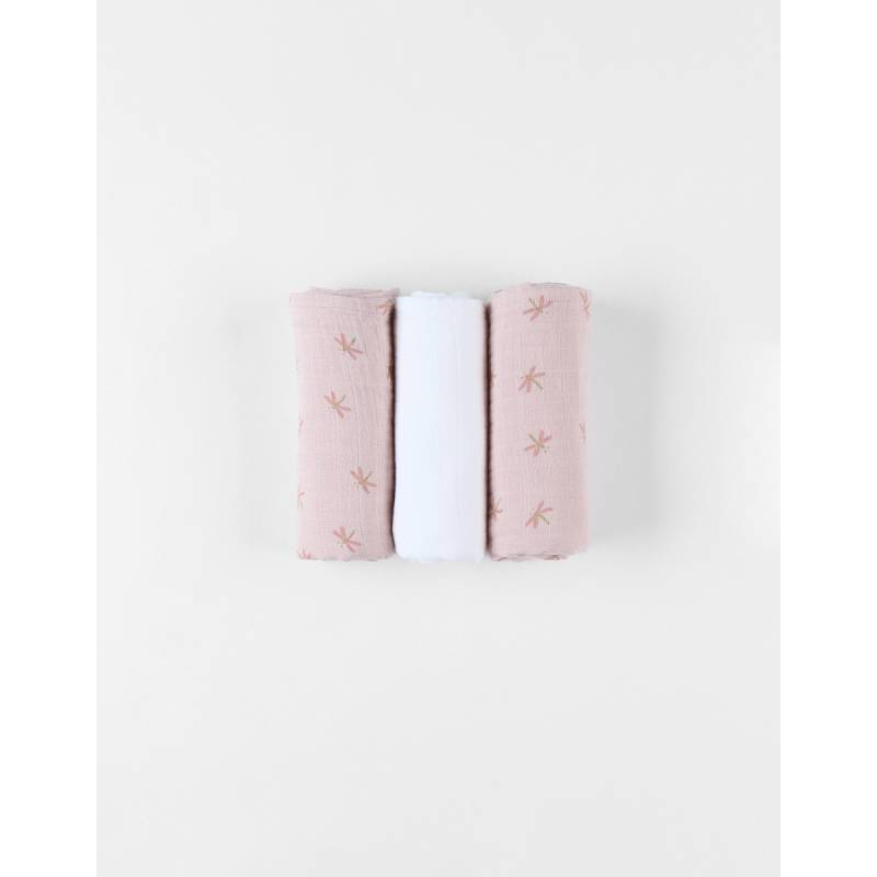 Set de 3 langes en mousseline de coton 70x70 cm: 2 en couleur rose poudré avec un imprimé libellules et 1 beige uni écru. Pratiques, ils peuvent être utilisés comme bavoirs, couverture, protège-épaule, pare-soleil... autant d'utilisations qui vous faciliteront la vie avec bébé !