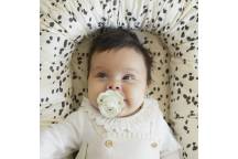 Tétine symétrique en silicone : douce, réversible et parfaitement adaptée aux bébés dès 3 mois.