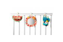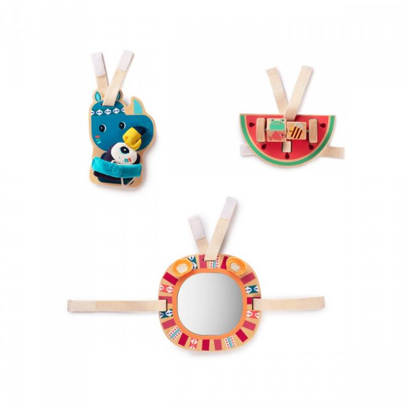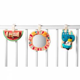 Ce set, constitué de 3 éléments indépendants, se fixe aisément au parc de bébé. Chaque panneau est composé de plusieurs matières et propose différentes activités. Le toucan se glisse dans les bras de Marius, les cubes permettent de former des paires sur la pastèque et le lion est un miroir.