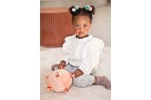 Cette balle sensorielle rose en tissu tout doux, sur laquelle s’amuse Stella le Faon, dispose de petites lichettes multicolores afin stimuler la motricité fine. A l’intérieur se trouve un boitier musical pour stimuler l'ouïe. A l’aide d’un bouton sur celui-ci, vous pouvez à tout moment décider d’activer ou non les sonorités.