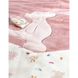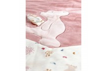 La couverture 100 x 140 cm en Veloudoux bicolore rose et imprimée nature de la collection Lina & Joy avec ses personnages tendres rebrodés garantit une grande douceur et infinie tendresse.