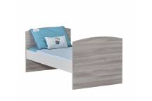Tête et Pied cadrés, avec un panneau haut en panneaux de particules revêtus de papier décor chêne silex, chants décor bois, et avec un panneau bas en panneaux de particules mélaminés décor blanc, chants décor bois.