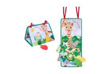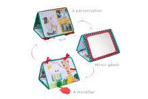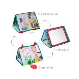 En position chevalet, bébé explore une face riche en textures, languettes et anneau de dentition, ainsi qu’un grand miroir pour se découvrir. L’autre face permet d’insérer des photos personnalisées, pour créer un lien affectif et familier.