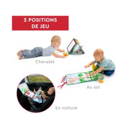 Déplié, ce livre devient un véritable terrain de jeu avec trois univers à explorer. Bébé y découvre des activités variées telles que des billes à déplacer, un grelot, du papier froissé ou encore des éléments à faire tourner, favorisant ainsi l’éveil sensoriel et la motricité.