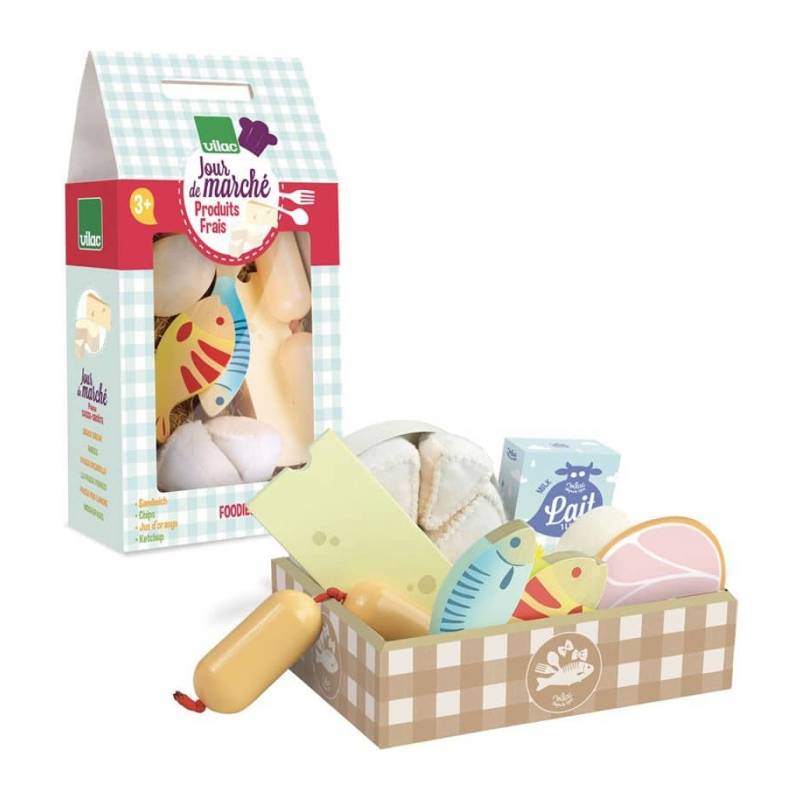 Ce set de poisson, viande et fromage en bois est idéal pour jouer à la marchande.