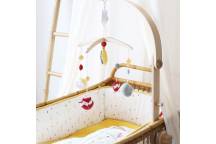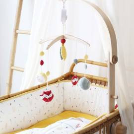 Ce mobile musical est maintenu par une arche en bois, se fixe au lit et fonctionne sans pile. Il peut également s’utiliser dans un parc pour les moments d’éveil de bébé.