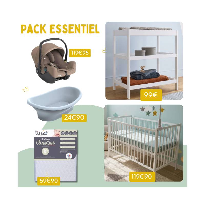 Avec ce pack, vous bénéficiez d’une sélection complète incluant un lit bébé, une baignoire, une table à langer, un matelas et un siège auto. Une solution idéale pour s’équiper facilement tout en profitant de prix avantageux.