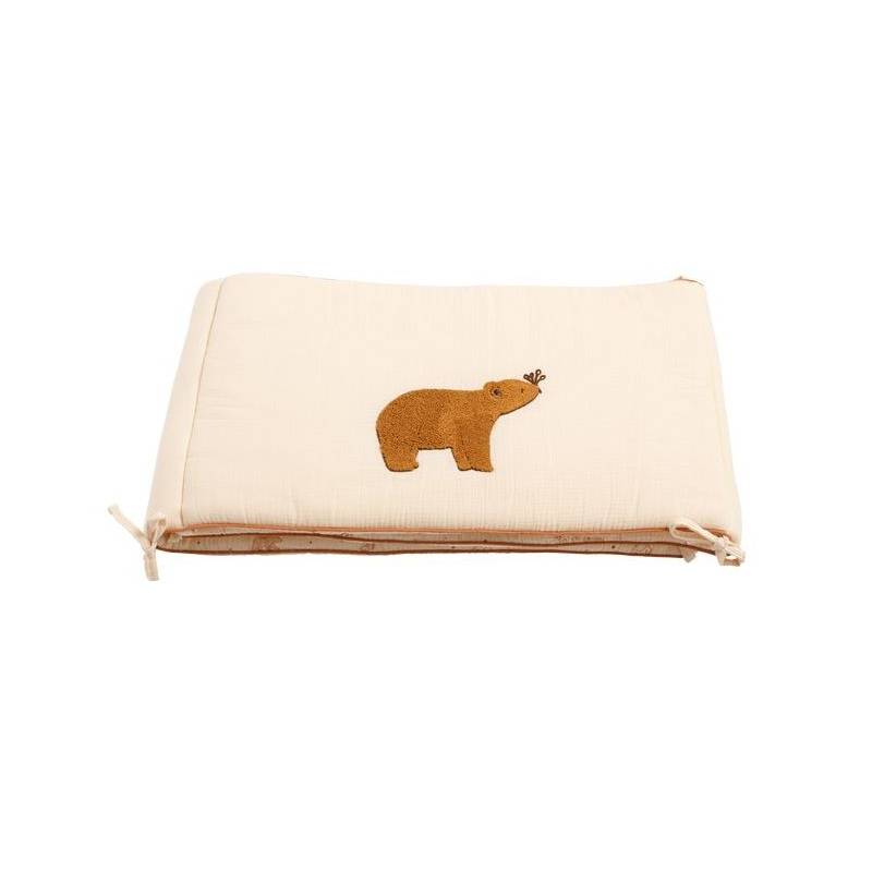 Ce tour de lit réversible en double gaze de coton de la collection Orsino, s'adapte au lit 120x60cm ou 140x70cm. Chaleureux et tendres, les motifs du thème Orsino apportent un style naturel et raffiné au lit de bébé. Ses couleurs enveloppantes toutes en ton sur ton apporteront une touche de décoration à la chambre de votre enfant. Très douillet il évitera à l'enfant de se cogner contre les barreaux du lit.