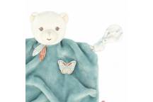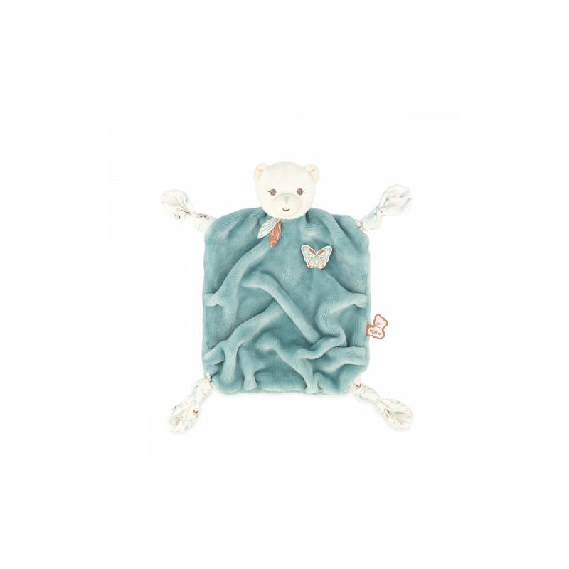 Le corps doux et moelleux de ce doudou ourson va ravir bébé, qui ne cessera de le câliner ! D'un beau coloris vert, ce doudou carré comporte 4 nœuds à manipuler par l'enfant, qui sont aussi très utiles pour y accrocher la tétine et ainsi la garder à proximité. Le petit minois de l'ourson et les motifs féériques imprimés de papillons font de ce doudou Kaloo un partenaire bienveillant pour bébé. Il arbore également de petites plumes au niveau de son cou et un papillon en relief brodé, comme posé sur son cœur.