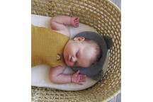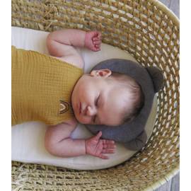 Le coussin P'tit Panda gris foncé de candide aidera bébé à garder une tête bien ronde grâce à sa mousse à mémoire de forme. La tête de bébé est légèrement surélevée.