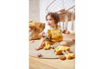 En micro-velours et en mousseline de coton, elle est aussi composée de rembourrage à base de polyester recyclé. Lavable en machine à 30°C, sans assouplissant, détachant ou autre additif.