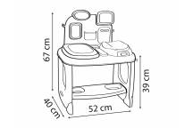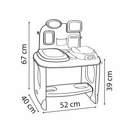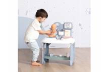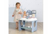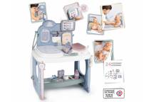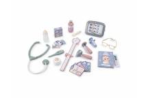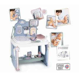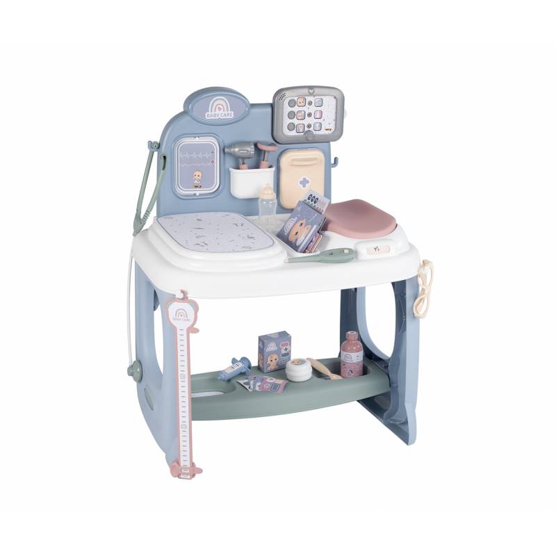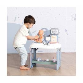 De nombreux espaces de jeu et accessoires sont inclus pour reproduire les gestes médicaux : lunettes docteur, tablette électronique (piles non incluses), écran rotatif avec test de vision et battements du coeur, carnet de santé à personnaliser et fiches médicales, pèse-poupon avec ressort et écran effet digital, toise amovible, table d'examen avec IML, stéthoscope, thermomètre action mécanique, otoscope, marteau à réflexes pour vérifier les fonctions motrices de son poupon, sirop, cuillère, crème, seringue action mécanique, boîte de pansements, pansements autocollants, biberon, bac de rangement, boîte à pharmacie avec tiroir basculant, tablette sous le produit, patères.