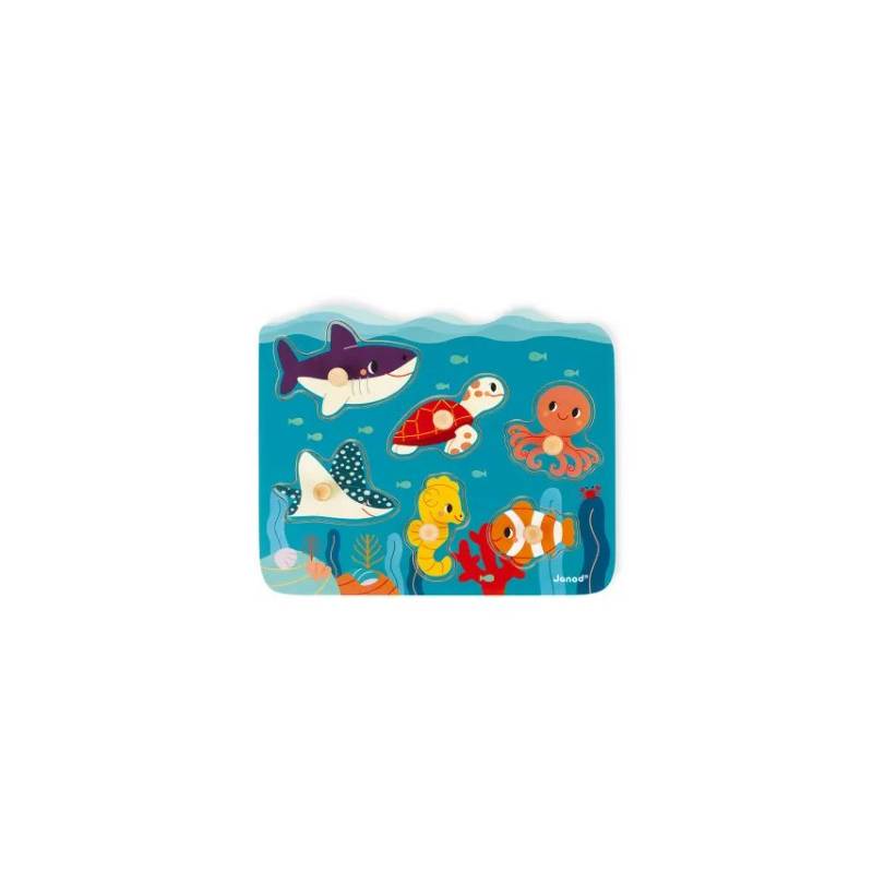 Les plus beaux et les plus impressionnants des animaux marins se sont réunis dans ce puzzle premier âge pour amuser et éveiller la curiosité des plus petits ! Ce puzzle en bois pour les bébés à partir de 18 mois permettra à votre enfant de plonger dans l'univers du monde marin tout en développant sa logique et sa motricité fine ! 6 pièces animaux sont à placer au bon endroit sur le plateau. Bébé peut facilement les déplacer grâce aux tenons en bois adaptés à la prise en main des plus petits. Bois certifié FSC® (bois issu de forêts gérées durablement). Peinture à l'eau.