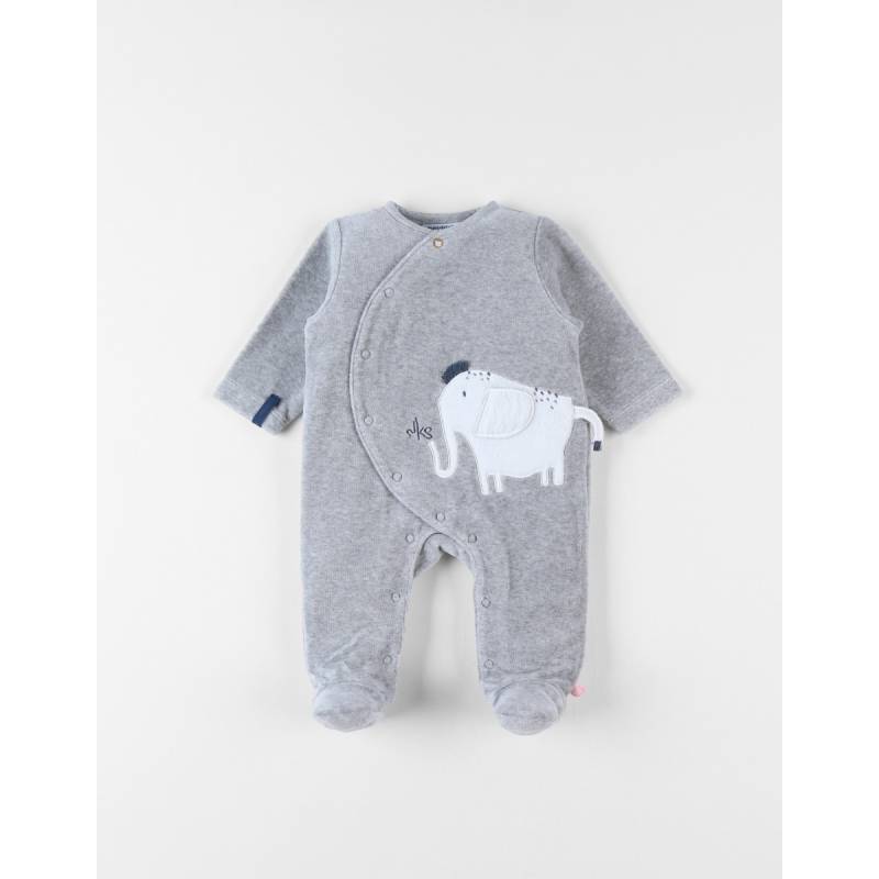 Le pyjama 1 pièce gris chiné en velours brodé d'un joli éléphant apporte douceur et confort pour le sommeil de bébé.