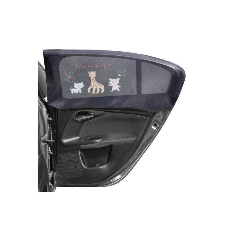 Set composé de 2 pare-soleil universels noirs, imprimés à l’effigie de Sophie la girafe sur le côté intérieur de la voiture, pour le plus grand plaisir de bébé.