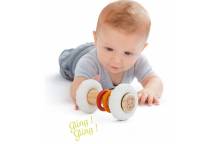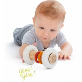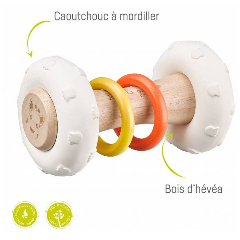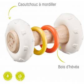 Un hochet qui mélange le caoutchouc 100% naturel et le bois d’hévéa pour éveiller les sens de bébé :